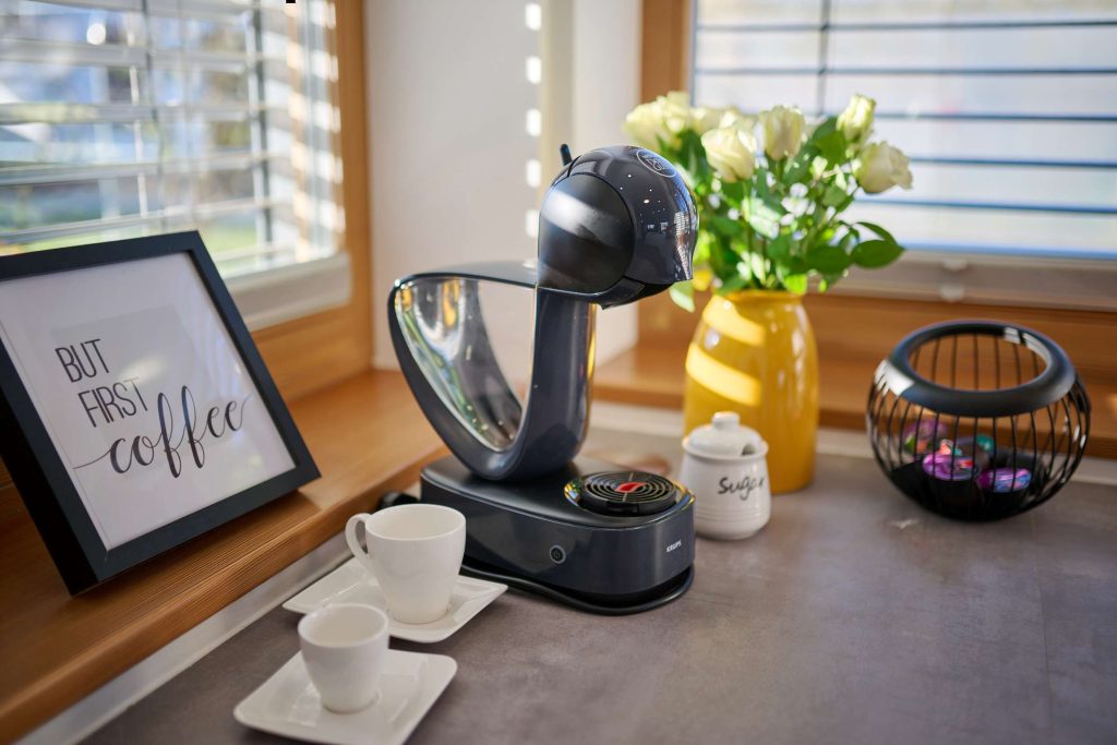 – prostorno kuhinjo z vso pripadajočo opremo (mikrovalovna pečica, hladilnik, avtomat za pripravo kave ali čaja, pribor itd.)